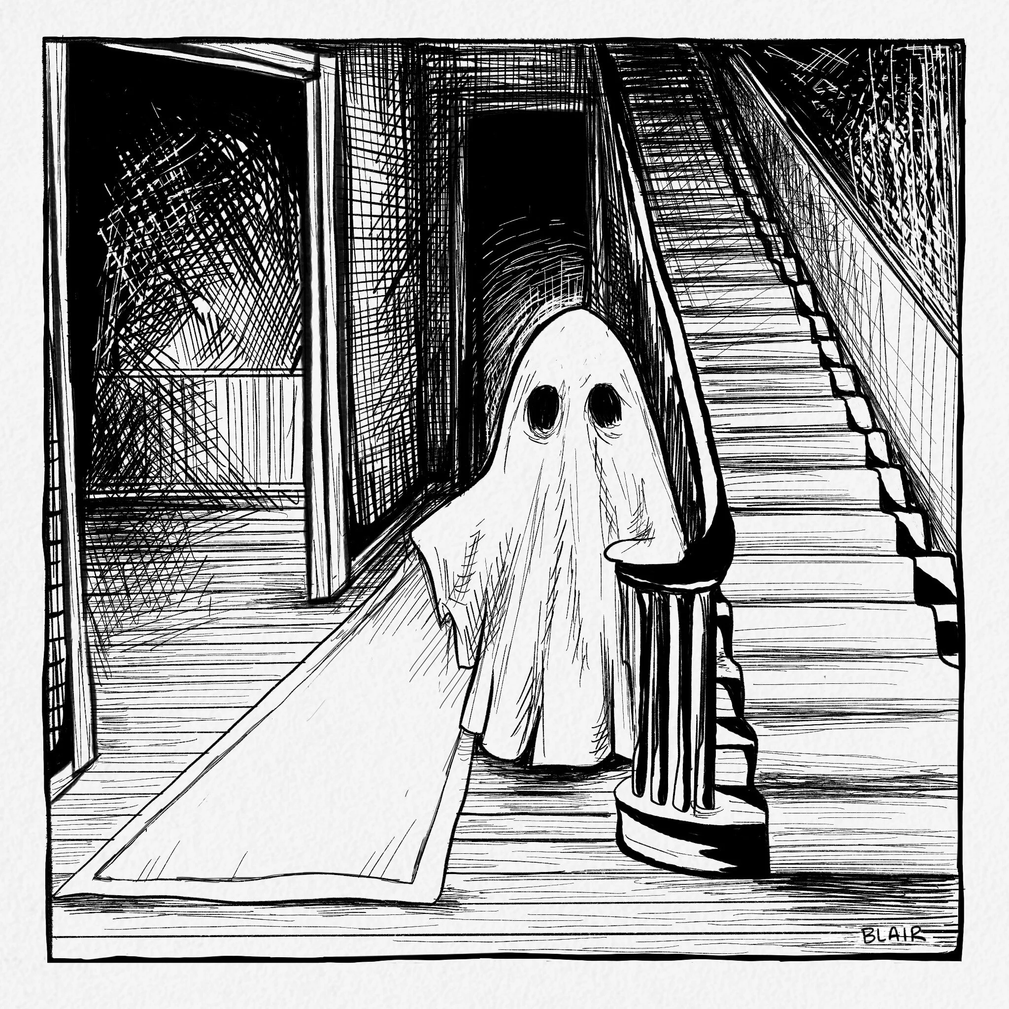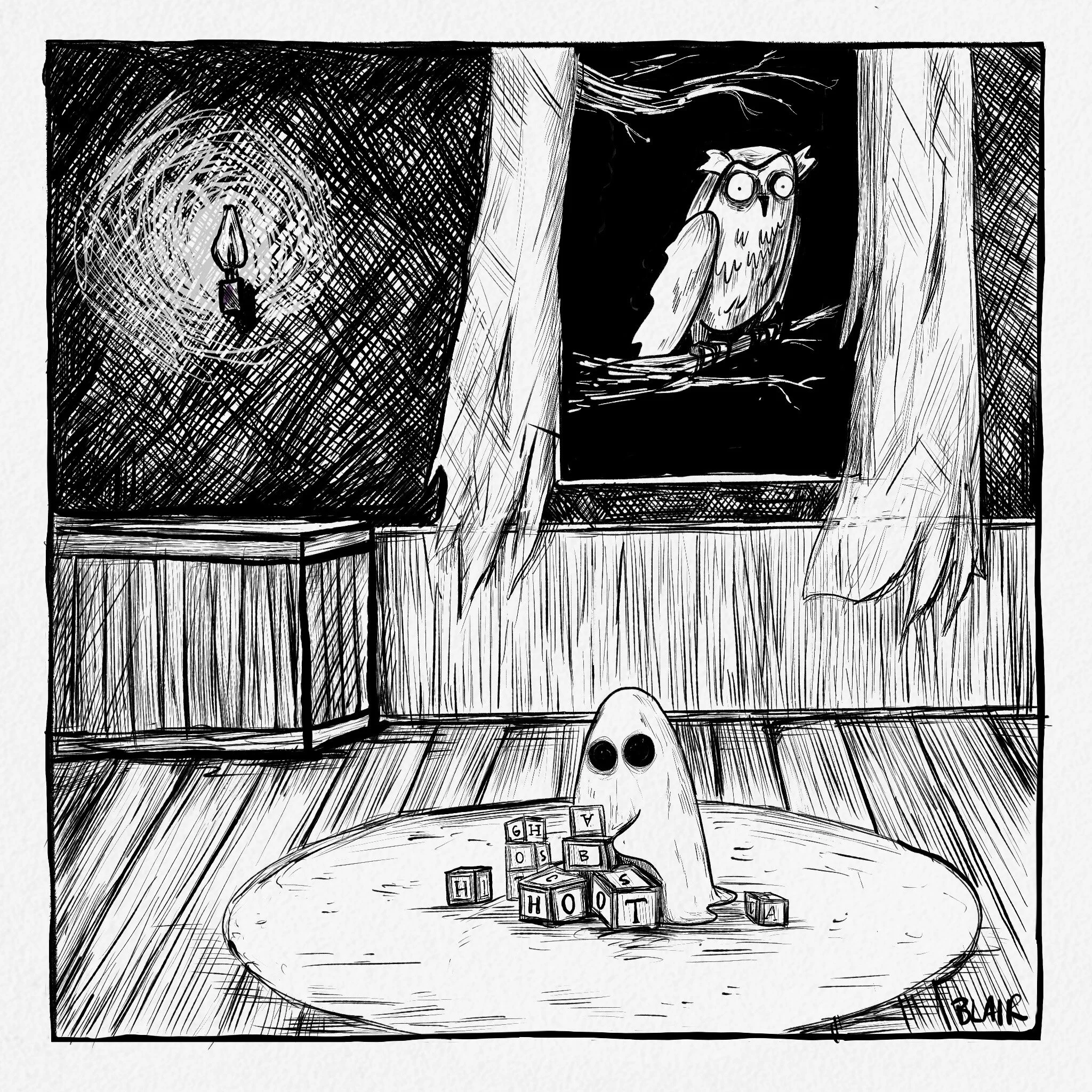This year I chose a theme of a House Tour. I really love drawing textures, especially textures found in old houses (wood, brick, tile, etc.) Of course I wanted to include fun creatures to guide the viewers as well.